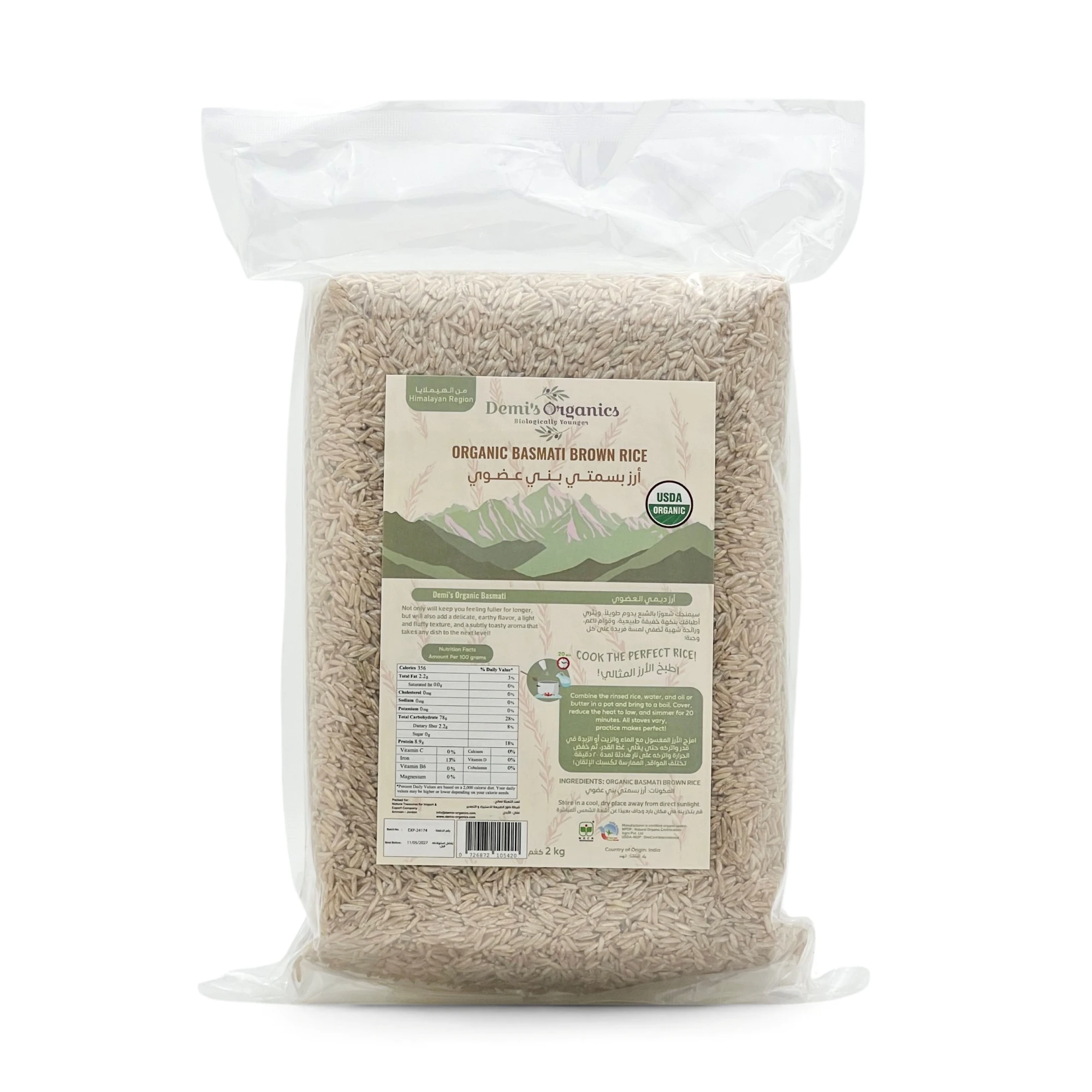 • يتم الحصول على أرز ديمي البني العضوي من منطقة الهيملايا المعروفة بأنقى حقول الأرز في العالم. تتميز هذه الحقول بكونها أقل الحقول تلوثا بالزرنيخ في العالم مقارنة بحقول الأرز الأخرى.