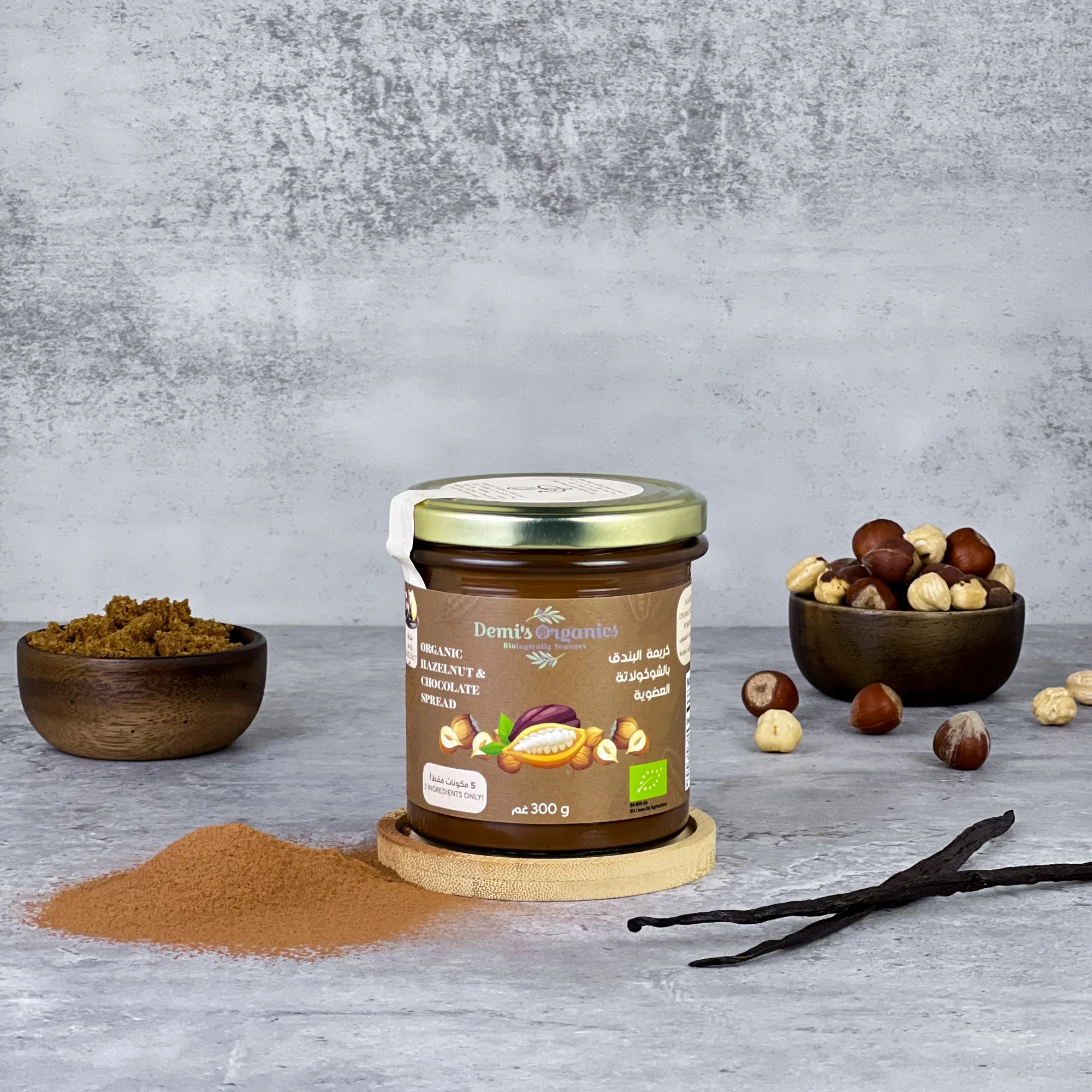 بندق عضوي، سكر جوز الهند العضوي، كاكاو عضوي، ملح بحري، فانيلا عضوية.